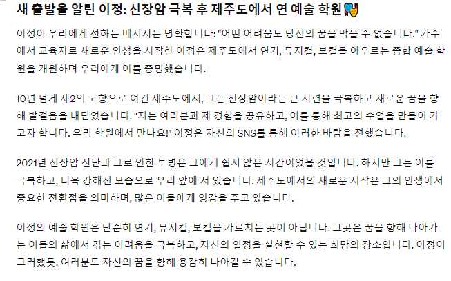 새 출발을 알린 이정: 신장암 극복 후 제주도에서 연 예술 학원🎭